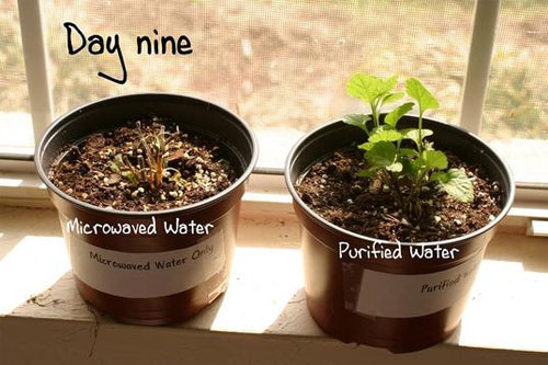 9ème jour après arrosage avec eau passée au micro-onde (à gauche) et eau normale
