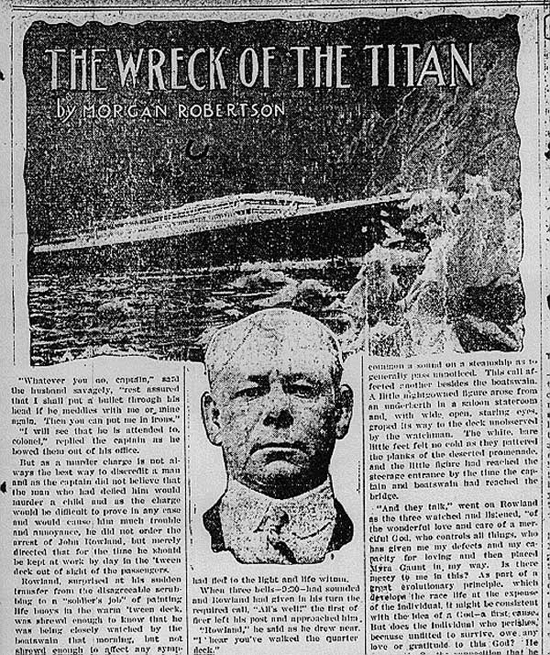 En 1889, Morgan Robertson écrivit un livre intitulé « Wreck of the Titan » (Epave du Titan) qui décrivait en détail la disparition d’un paquebot de luxe qui heurtait un iceberg et tuait tout le monde à bord.