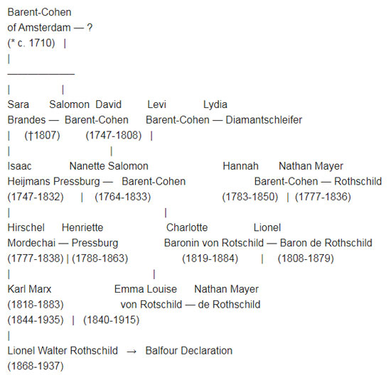 Un des grands parents de Marx était Nanette Salomon Barent-Cohen, qui appartenait à une puissante famille d’Amsterdam. Sa cousine avait épousé Nathan Mayer Rothschild et donné naissance à Lionel Nathan Rothschild, le « Baron » et Membre du Parlement de la City de Londres.