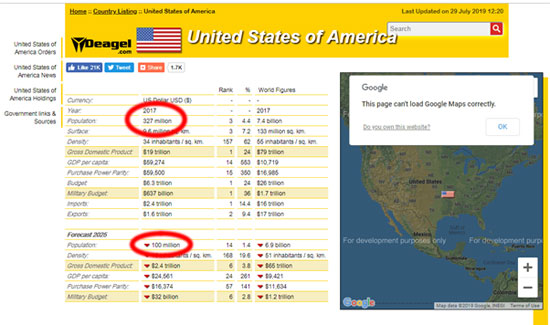 Comme vous pouvez le voir sur la page ci-dessous, accessible directement ici, la population des États-Unis devrait atteindre 100 millions d’ici à 2025, contre 327 millions en 2017.