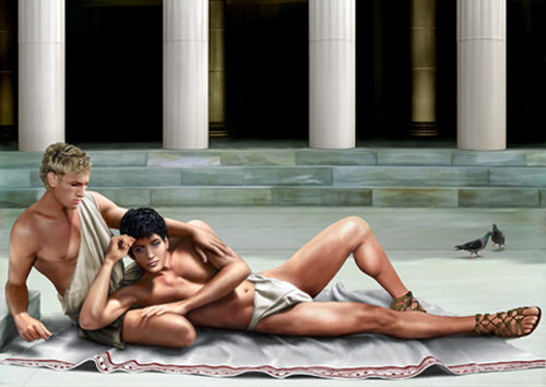 Illustration de la décadence de Rome. On perçoit ici l’efféminement des deux « hommes ». L’homosexualisation de l’oeuvre illustre clairement la persistance de l’homosexualité dans la société actuelle.
