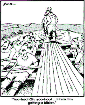Un esclave ramant dans une galère de Viking lève la main et appelle le maître qui tient le fouet :