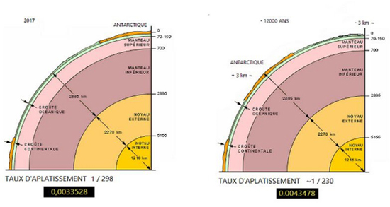 Et comme ce continent ne s’est pas volatilisé, il a augmenté le rayon équatorial d’environ 3 km au maximum (on sait que l’Antarctique ne se trouvait pas à l’équateur), ce facteur d’aplatissement de 1/230 est une manière mathématique et symbolique de nous indiquer le déplacement de l’Antarctique !