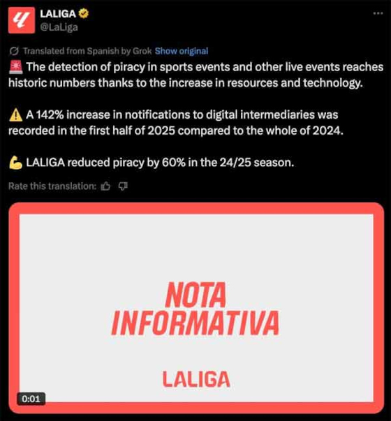 LaLiga, quant à elle, continue de vanter ses résultats en matière d’application de la loi. Un rapport publié par ses soins a révélé que plus de 26 millions d’avis de retrait ont été envoyés au cours du seul premier semestre 2025, soit plus du double du total de l’ensemble de l’année 2024.
