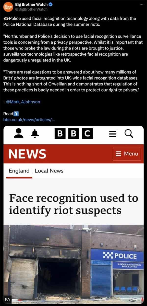 « C’est tout simplement orwellien et cela démontre que la réglementation de ces pratiques est absolument nécessaire pour protéger notre droit à la vie privée », a déclaré le groupe, en réaction à la divulgation par la police de Northumbria de ses pratiques, en particulier lors des émeutes de l’été.