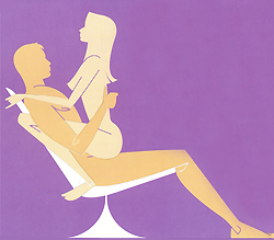 Pour la pratique de cette posture, qui est en elle-même un jeu merveilleux, l’amoureux se trouve dans un fauteuil, avec les jambes écartées. Son amoureuse vient au-dessus de lui, lui enlaçant les cuisses, la tête tournée vers lui. Ses pieds sont fermement soutenus sur le fauteuil. Elle est celle qui prend l’initiative, bougeant parfois avec délicatesse, parfois avec vigueur, s’appuyant simultanément sur les bras. L’amoureuse peut jouer de façon provocatrice avec son yoni au-dessus du corps de son amoureux.