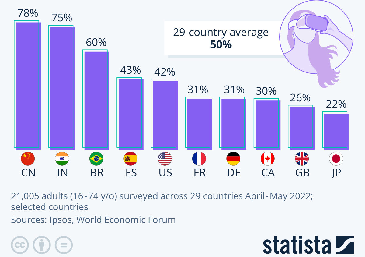 Dans une étude menée dans 29 pays en avril/mai 2022, Ipsos a constaté que seulement 50 % des 21 005 personnes interrogées se sentaient très ou plutôt positives quant à l’utilisation d’appareils ou d’applications de réalité virtuelle, augmentée ou étendue dans leur vie quotidienne, les marchés les plus développés d’Europe et d’Amérique du Nord se montrant encore moins enthousiastes.