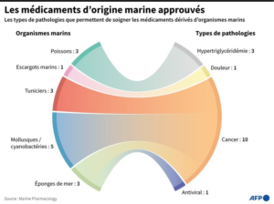 Au total, 17 médicaments d’origine marine ont été autorisés pour traiter des maladies humaines depuis 1969, et une quarantaine d’entre eux sont à divers stades d’essais cliniques dans le monde, selon le site Marine Drug Pipeline.
