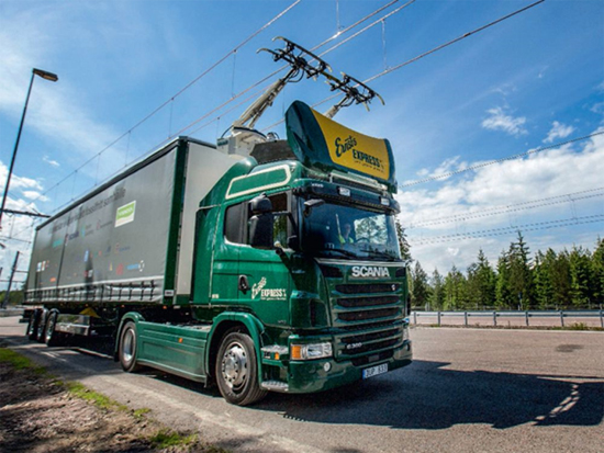 Équipés de pantographes, des camions captent le courant par frottement avec la caténaire installée au-dessus d’une voie d’autoroute. Ici, un test sur une portion de route de deux kilomètres près de Stockholm, en Suède.