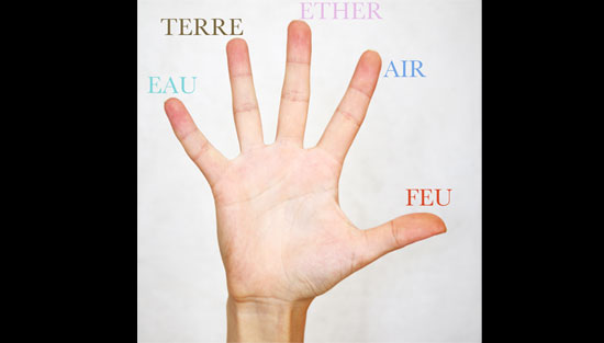 Les mains sont considérées comme notre organe d’action le plus précieux. On dit que les mains et les pieds sont les conduits des cinq éléments : l’espace, l’air, le feu, l’eau et la terre. L’un des cinq éléments parcourt chaque doigt. A travers le pouce, angushtha, vient l’espace, à travers l’index, tarjani, l’air ; à travers le moyeu, madhyama, le feu; à travers le doigt, anamika, l’eau et à travers le petit doigt, kanishtha, la terre.