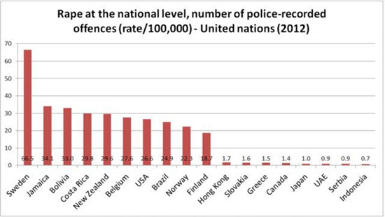 La liste des 10 premiers pays responsables des viols au niveau national ne montre qu’un seul pays non islamique (Chili). La plupart des violeurs sont issus d’Irak, suivis des réfugiés et des migrants d’Afghanistan, de Somalie, d’Érythrée, de Syrie, de Gambie, d’Iran, de Palestine, du Chili et du Kosovo.