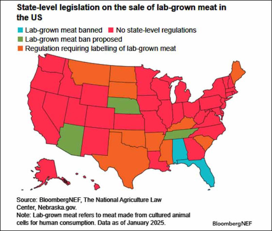 Deux États, la Floride et l’Alabama, ont interdit la consommation de viande produite en laboratoire, tandis que trois autres ont proposé des restrictions similaires pour la viande controversée imprimée en 3D. En outre, dix États imposent désormais l’étiquetage de la viande produite en laboratoire. Dans le reste des États-Unis, aucune réglementation ne régit la fausse viande.