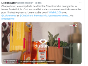 « C’est surtout que l’acide ascorbique n’a jamais eu pas comme rôle biochimique de ” lutter contre le rhume ” mais pour conserver un bon fonctionnement immunitaire. La vitamine C n’est plus synthétisé chez l’Homme du fait de mutation génétiques et l’Homme qui doit la trouver dans son alimentation , et elle est sensible à la chaleur donc il peut être assez facile d’en être déficitaire si on a une mauvaise alimentation. Elle est un cofacteur enzymatique, intervient dans la synthèse du collagène et des globules rouges et contribue au bon fonctionnement du système immunitaire, elle est un agent anto oxydant capable d’éliminer rapidement un certain nombre de dérivés réactifs de l’oxygène….…) produit en cas d’attaque microbienne. Une carence se traduit par une faible résistance aux infections, une fatigue. La Collaboration Cochrane a conclu que la vitamine C n’empêche pas le rhume (pas d’effet préventif, c’est-à-dire pas de réduction du nombre de cas de rhume) dans la population générale mais que cette vitamine peut réduire la durée et la sévérité des rhumes, et qu’elle peut se justifier chez les sujets exposés au froid et en effort physique intense (essais portant sur les militaires et des marathoniens). En résumé, on donner en supplément tout au long de l’année n’est pas superflu et n‘enrichit pas les labo (pas plus que l’industrie alimentaire). Ne pas donner de suppléments vitaminiques à des personnes âgées dans des EHPAD n’est pas bioethiquement correct. Et si vous commencez à vous attaquer à tout ce qui est vendu et que vous jugez ” superflu ” pour faire du buzz journalistique dont vous vivez , je pense qu’il y a bien d’autre produits plus prioritaires que la vitamine C à attaquer en ce cas. On pourrait causer doliprane pour réduire la fièvre par exemple ? »