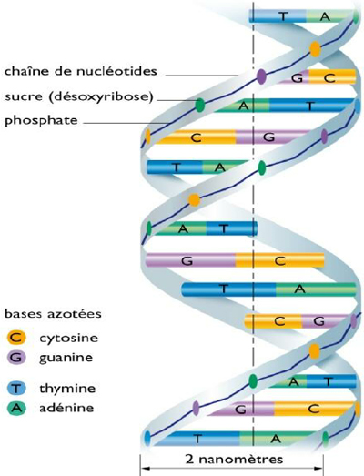 Les 2 brins sont enroulés en hélice autour d’un axe commun, et réunis par des liaisons horizontales entre bases azotées