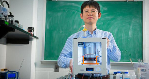 Le chercheur Chi Zhou avec l’imprimante 3D qui a servi à créer l’aérogel de graphène