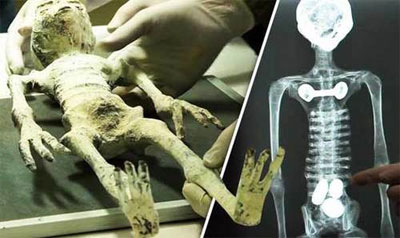 Cette momie de 53 cm, assise avec les mains tridactyles posées sur les genoux et sans tête, a une peau reptilienne et est datée d’environ un millier d’années. Pour effectuer une telle contrefaçon, il aurait donc fallu trouver à la fois des ossements et une peau de reptile datant d’un millier d’années et assembler le tout. A l’analyse ADN, les os ne contiennent qu’environ 30% d’ADN d’homo sapiens. On ne retrouve pas de glandes sudoripares, ces êtres ne transpiraient pas et ne perdaient donc pas d’eau. Leur biologie est parfaitement adaptée aux déserts du style Nazca.