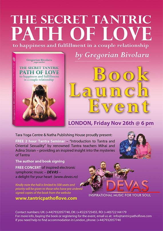 Londres : Le vendredi, 26 novembre 2010 à 18h, Tara Yoga Centre et Natha Publishing House ont organisé le lancement du livre « les secrets amoureux essentiels pour un couple qui aspire à être heureux », du professeur de yoga Gregorian Bivolaru, nouvelle édition, en Anglais, enrichie par l’auteur.
