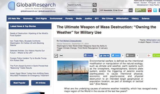 Dans une étude majeure, le Pentagone a analysé en détail les implications de divers scénarios de réchauffement climatique. Le document du Pentagone constitue une couverture commode. Pas un mot n’est mentionné au sujet de son principal programme de guerre météorologique : le Programme de Recherche Aurorale Active à Haute Fréquence (HAARP) basé à Gokona en Alaska – géré conjointement par l’US Air Force et la US Navy.