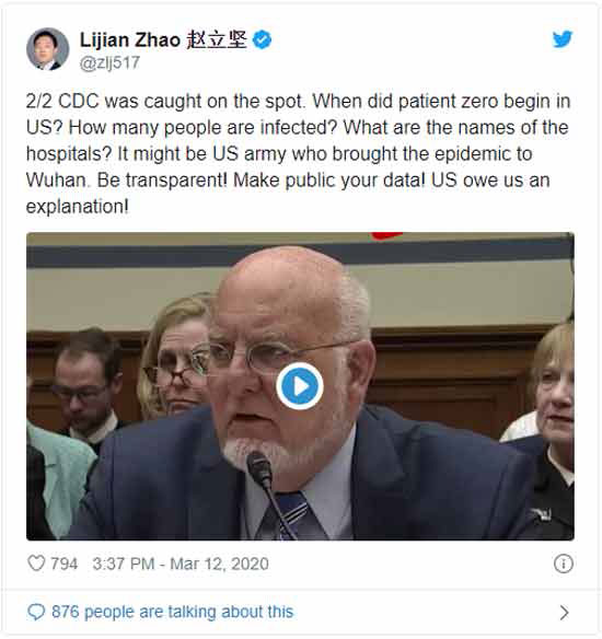 Le porte-parole du ministère des affaires étrangères, Zhao Lijian, a fait ces remarques sur son compte Twitter officiel, citant le témoignage télévisé du directeur des CDC, Robert Redfield, devant la commission de surveillance de la Chambre :