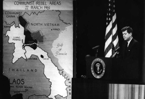 DiEugenio fait remonter les idées générales de Kennedy sur la politique étrangère à 1951, lorsque Kennedy fit une tournée au Moyen-Orient et en Asie pour s’informer par lui-même. Sa rencontre à Saïgon avec Edmund Gullion, qu’il fit entrer plus tard dans son cabinet, l’avait convaincu que l’envoi de troupes américaines en Indochine serait une grave erreur[4]. Il ne changerait jamais d’avis sur cette question[5].