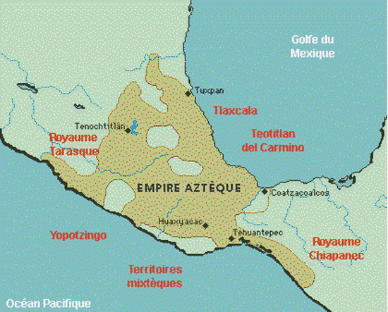 De 1440 à 1502, sous le règne de Moctezuma et de ses successeurs (Axayacatl, Tizoc, Ahuiltzol), l’empire Azthèque ne cessera de s’étendre. Seules quelques régions résisteront à la pression aztèque. Moctezuma Xocoyotzun (1502 – 1520), lui, paralysé par le souvenir des anciennes traditions toltèques, croira reconnaître en Hernan Cortès le roi toltèque Quetzalcoatl (le Serpent à plumes) ainsi qu’il avait été prédit. À son invitation les conquistadores pénètrent à Mexico le 8 novembre 1519.