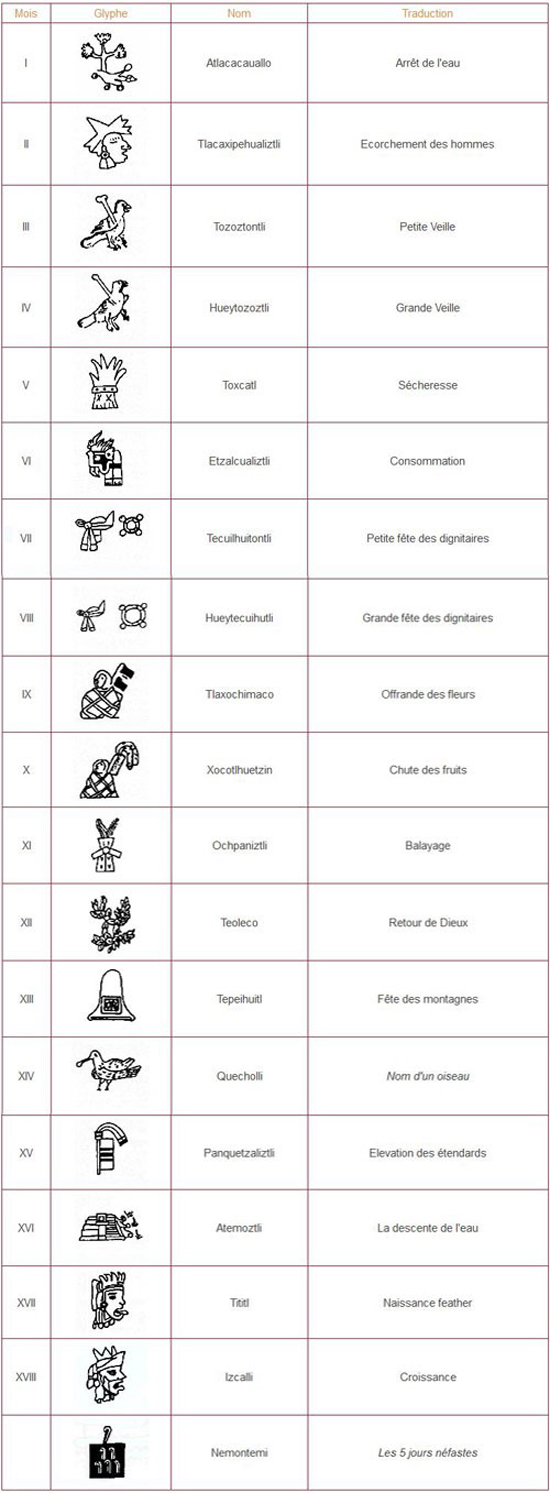 Même construction que pour son homologue Maya : « Année » (xihuitl) = 18 « mois » (meztli) de 20 jours + 5 jours néfastes (nemontemi).