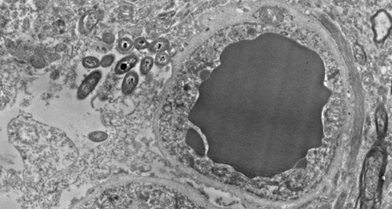 Des images de tranches de cerveau humain révèlent des bactéries, situées ici à gauche d’un vaisseau sanguin. Une preuve alléchante, mais préliminaire, d’un « microbiome cérébral ».