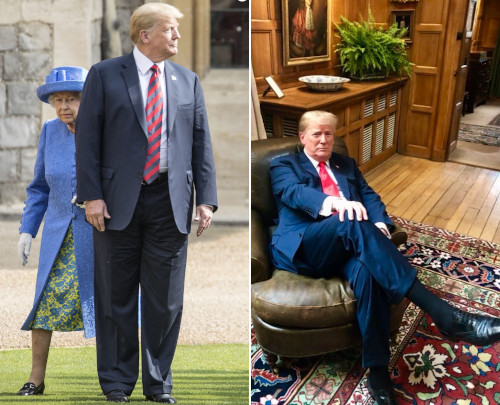 Ensuite, nous avons eu l’événement Trump/La Reine où à maintes reprises, il a enfreint le protocole (comme de passer devant la reine) et où encore, lorsque Trump s’est assis dans le fauteuil en cuir préféré de Churchill en adoptant la pose d’un patron. Il était en position de faire tout ce qu’il voulait.
