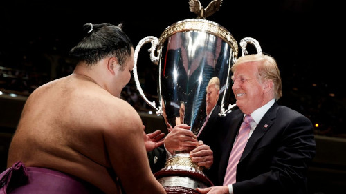 Puis vint le Japon où Trump a remis le plus prestigieux trophée au champion de Sumo, ce qui est normalement fait par le plus haut dignitaire du Japon.