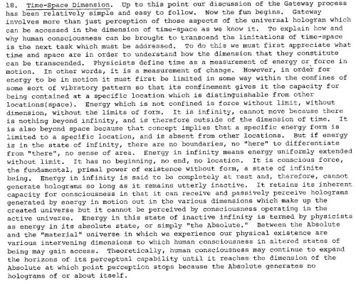 Alors que beaucoup de gens rejettent le plan astral comme simple expérience qui modifie l’esprit, ce qui peut être expliqué entièrement par la science, il semble que la CIA n’est pas de cet avis. Dans le document publié en 2003, on explique que les enquêtes ont révélé que le plan astral n’était certainement pas un mythe. Le document se réfère également à un concept appelé « L’Absolu » qui imprègne chaque instant du temps et de l’espace dans chaque dimension. L’Absolu est décrit comme étant omniprésent et omnipotent dans le document.