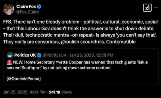Une autre membre de la Chambre des Lords, Claire Fox, a réagi à la tendance à faire pression sur les plateformes pour qu’elles suppriment les « contenus extrêmes », sous peine de « risquer un second Southport », par quelques mots bien choisis postés sur X :