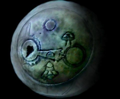 L’une des pièces maîtresses dévoilées est un disque on ne peut plus explicite. On peut y voir clairement 4 engins, communément appelés OVNI, dont l’une démontre par une extraction, un astronaute (5) aux commandes de son engin (6). Les deux cercles au centre (1) sont présentement considérés comme une planète à atmosphère de par les deux cercles le suggérant et qu’on peut supposer être la Terre du fait de la présence d’un astre à proximité qui semble être la Lune. À droite, ce qui semble être une comète (3) avec un OVNI (2) dans son sciage, puis, à gauche, un autre engin (4) qui semble intervenir directement sur la comète comme porteur d’un bélier pour frapper la comète.