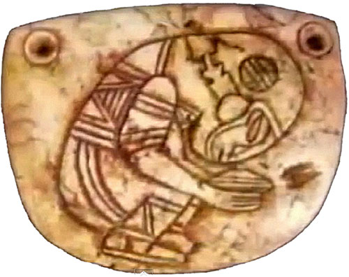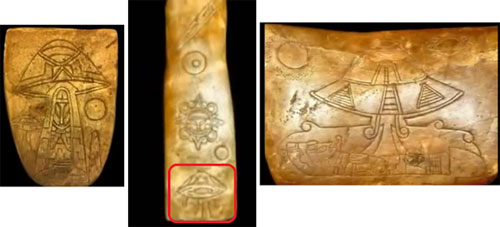 Une autre pièce fort intrigante semble représenter une éruption solaire. Le soleil envoie un jet de rayon vers la même planète à atmosphère, soit la Terre, événement régulièrement mesuré par la NASA dont vous pouvez suivre l’activité sur le site Space Weather. Trois OVNIs sont présents sur cet artefact dont l’un est directement dans le jet plasmique. Une autre planète est également présente, mais il est difficile de préciser laquelle de notre système solaire.