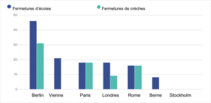 Période : janvier 2020 au 25 juillet 2021. Les vacances n’ont pas été déduites des fermetures d’écoles et de garderies. Les cours alternés ont également été pris en compte en Allemagne. Les écoles n’ont été complètement fermées que pendant 18 semaines. Source : Département fédéral de l’intérieur (DFI).