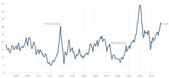 Aujourd’hui, comme en 1987, les actions affichent des multiples de valorisation très élevés, surtout à Wall Street. Une façon de jauger leur cherté consiste à examiner le PER (capitalisation boursière rapportée aux bénéfices) corrigé du cycle, mis au point par le prix Nobel 2013 d’économie et professeur de l’Université de Yale Robert Shiller. Cet indicateur, aussi appelé PER de Shiller, compare la capitalisation boursière du S&P500 à la moyenne des bénéfices réels (c’est-à-dire en tenant compte de l’inflation) sur 10 ans. Il est actuellement à 32, un score historiquement élevé. Depuis 1900, il n’a été plus haut que lors de la bulle Internet des années 90. S’il était inférieur à 20 en 1987, les actions américaines étaient néanmoins aussi considérées comme chères alors, au vu notamment de la concurrence des obligations d’Etat à long terme, dont la rémunération dépassait 9%.