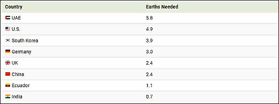 Les pays qui ont un excédent écologique, en revanche, sont appelés « créanciers de biocapacité ». Si tous les habitants de la planète vivaient comme ces pays, nous aurions besoin de moins de Terres et non de plus de Terres.