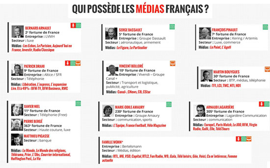 Ils sont cinq à faire partie du cercle des dix premières fortunes de France : Bernard Arnault, PDG du groupe de luxe LVMH (patron des Echos, du Parisien), Serge Dassault (Le Figaro), François Pinault (Le Point), Patrick Drahi, principal actionnaire de SFR (Libération, L’Express, BFM-TV, RMC), Vincent Bolloré (Canal+). On trouve ensuite Xavier Niel, patron de l’opérateur de téléphonie Free et 11ème fortune de France, qui s’est associé avec Pierre Bergé, héritier du couturier Yves Saint-Laurent, et avec le banquier Matthieu Pigasse, pour devenir propriétaire du groupe Le Monde (L’Obs, Télérama, La Vie…). Matthieu Pigasse possède également Radio Nova et l’hebdomadaire Les Inrocks.
