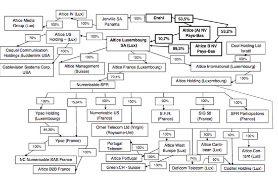 Voir l’organigramme de l’empire industriel de Patrick Drahi, réalisé par l’économiste Benoît Boussemart et publié par Le Canard enchainé :