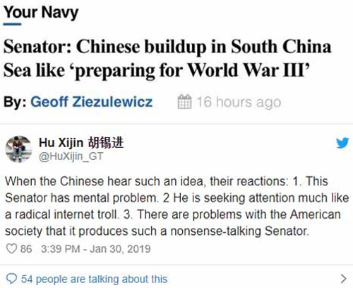 Sans surprise, la Chine n’était pas ravie de l’évaluation d’Inhofe ; le rédacteur en chef du Global Times de langue anglaise, un porte-parole du Parti communiste, a accusé le sénateur d’avoir des « problèmes mentaux ».
