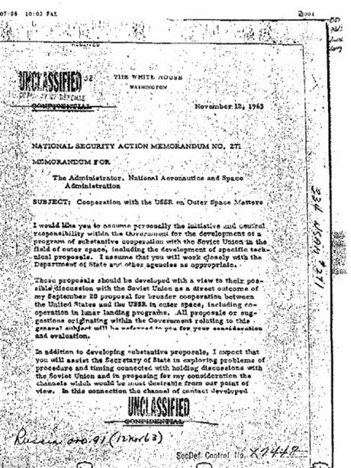 Dans la deuxième note de service, envoyée à l’administrateur de la NASA, le président exprime le souhait de coopérer avec l’ex-Union soviétique sur les activités spatiales mutuelles.
