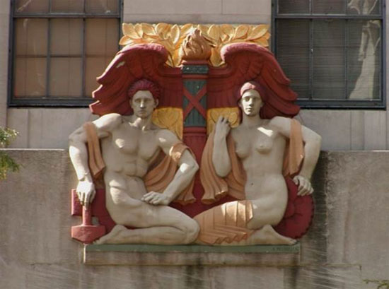 Mais, qu’est-ce que tout cela à avoir avec le Rockefeller Center ? Les sculptures, bas-reliefs et fresques murales se rapportent tous au même thème : le triomphe de l’homme sur DIEU à travers l’acquisition de connaissances.