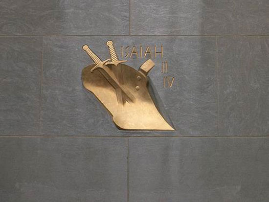 Ce relief se réfère à Esaïe 2:4 et représente des épées transformées en socs de charrue. Voici le verset biblique :