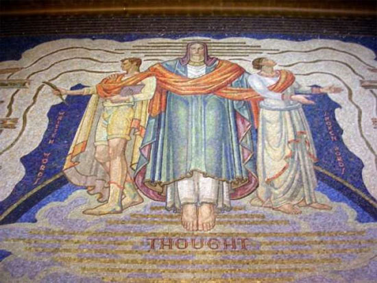 Fresque représentant la pensée comme une figure divine transmettant son don à l’homme et le sort de l’ignorant :