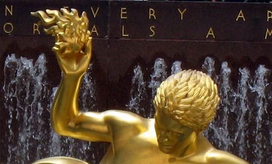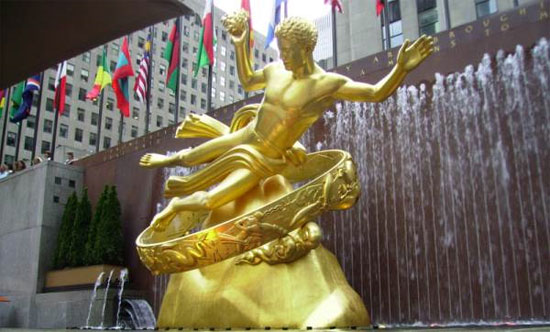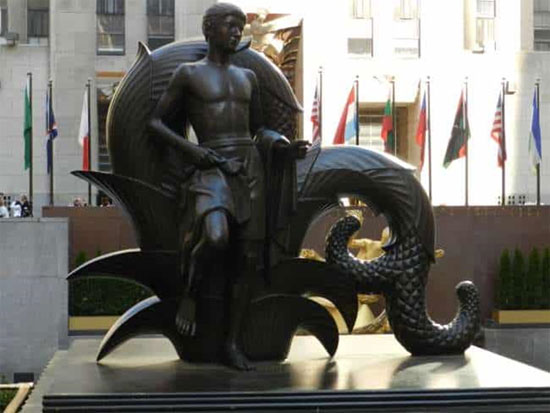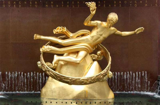 La sculpture de Paul Manship mise en évidence dans la Sunken Plaza du Rockefeller Center dépeint Prométhée portant le feu dérobé à Zeus et glissant en direction de l’humanité. Il se trouve à l’intérieur d’un anneau dans lequel sont dessinés les signes du zodiaque. Derrière la statue se trouve une inscription disant : « Prométhée, enseignant dans tous les arts, a introduit le feu qui s’est avéré être pour les mortels un moyen pour de puissantes fins. »