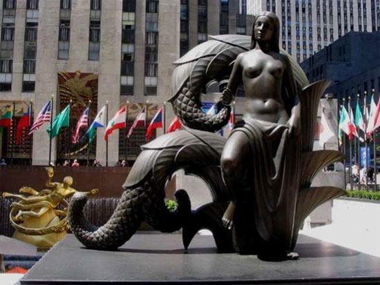 Ce complexe de 19 bâtiments commerciaux est situé entre les 7ème et 5ème avenues à New York, et est célèbre pour son style Art Déco. C’est l’un des derniers projets de construction aux Etats-Unis à avoir intégré un programme d’art public. Les présentations choisies correspondent toutes à une philosophie particulière, et certains artistes ont été invités à modifier leur oeuvre afin qu’elle corresponde au thème du Rockefeller Center, qui est : le Luciférisme.