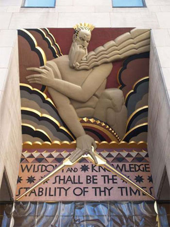 Au-dessus de l’entrée du GE Building se trouve cette frise Art déco. Elle représente un homme barbu tenant un compas énorme et une citation du Livre d’Esaïe. C’est une référence directe à la gravure de William Blake « Urizen », où DIEU est un homme barbu tenant un compas.