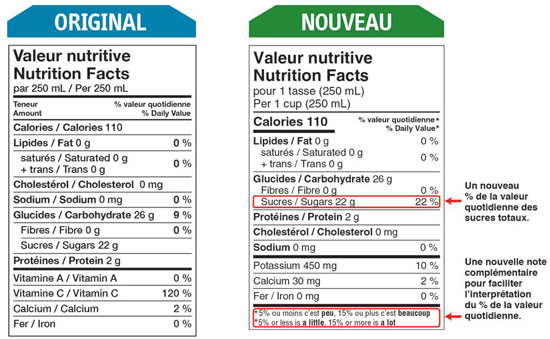 Annoncé en juin 2015 par la ministre Rona Ambrose, le nouvel étiquetage nutritionnel prévoit notamment de regrouper, dans la liste des ingrédients, toutes les formes de sucres à l’intérieur d’une même parenthèse.