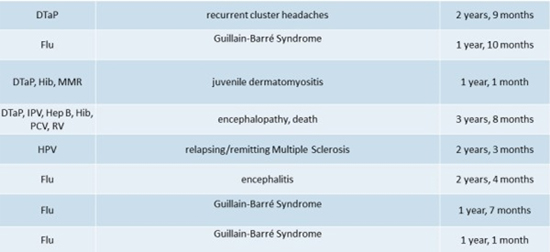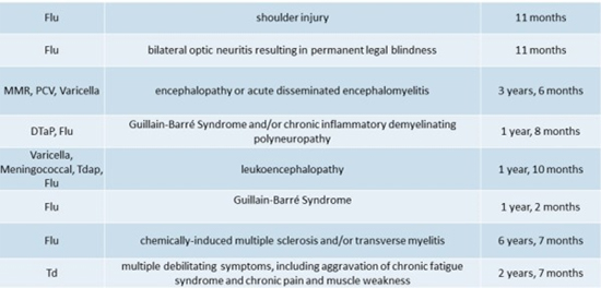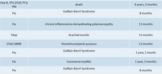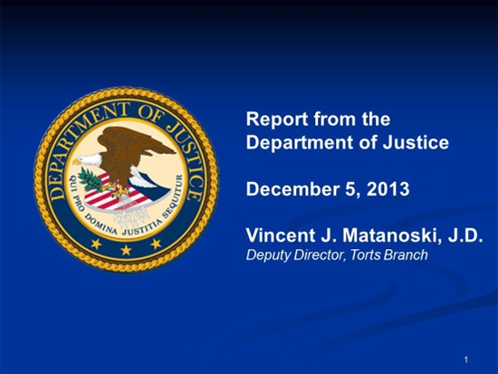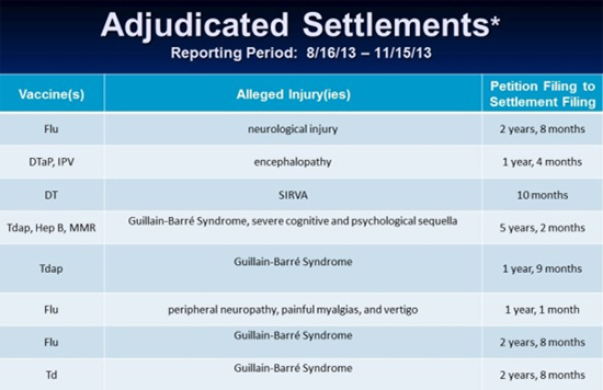Un des rapports publiés par le Ministère de la Justice (« Tribunal des Vaccins » ) concernant les dédommagements, par les services de la Santé (Health & Human Services), des personnes dont la santé a été endommagée ou qui sont mortes à la suite de vaccinations, a été rendu public en décembre 2013. Ce rapport couvre la période du 16/08/2013 au 15/11/2013. Le rapport est disponible sous forme de Power Point: ICI.