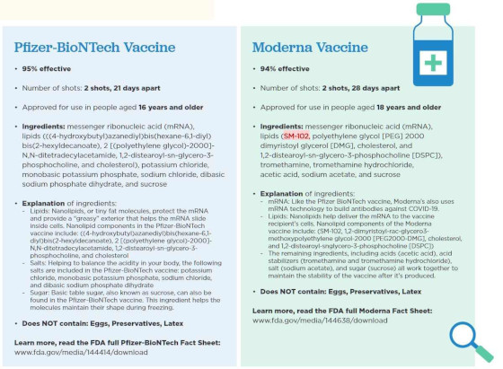 1. Le vaccin Moderna ne contient pas de chloroforme mais utilise du SM-102, qui fait partie du lipide utilisé pour délivrer le code génétique, ou ARNm de la protéine de pointe qui recouvre le coronavirus, dans nos cellules. Source : AP