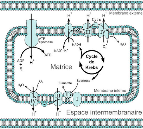 Schéma de principe de la phosphorylation oxydative dans une mitochondrie illustrant les complexes I, II, III et IV ainsi que le cytochrome c.